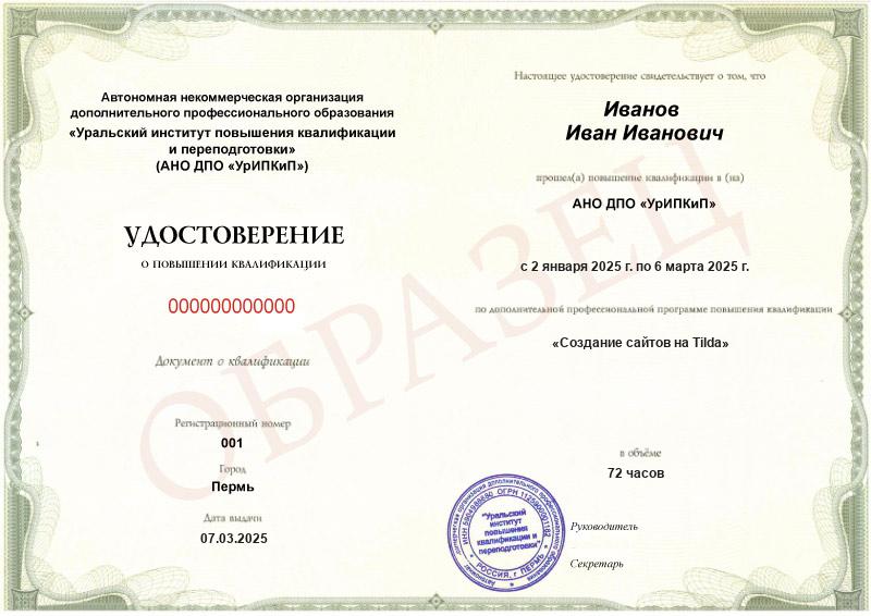 - Образец удостоверения о повышении квалификации.